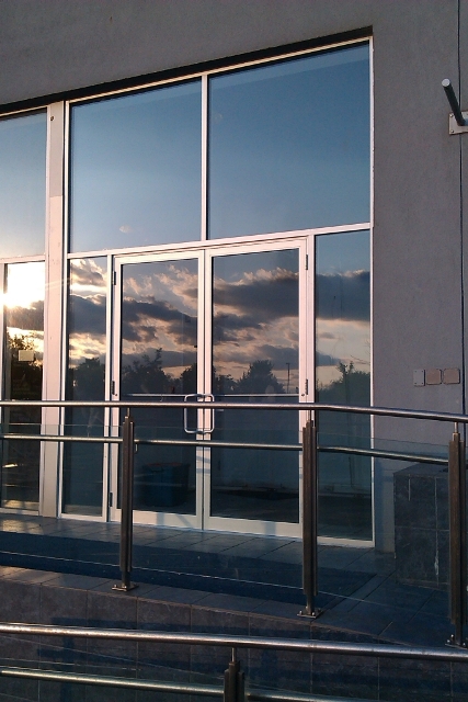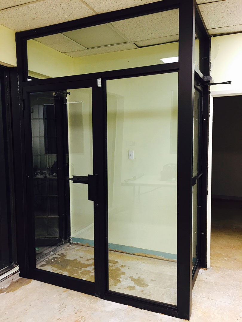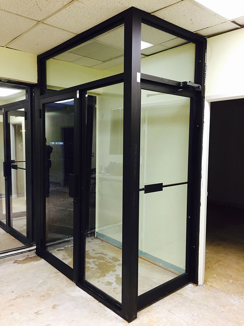 Fabricated and installation a Bronze Anodized aluminum vestibule with two doors and safety tempered glass In Markham.